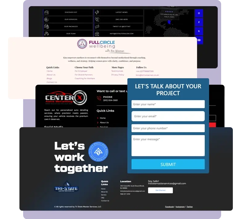 A selection of creative and responsive footer layouts designed to organize essential links, contact details, and business information effectively. These 6–7 footer styles ensure better user engagement, improved accessibility, and a polished website appearance while supporting strong branding and seamless navigation.