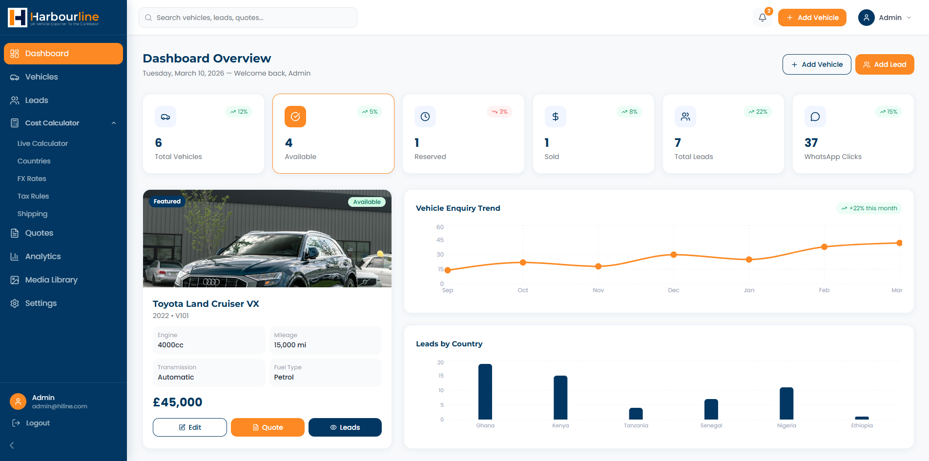 A custom-built car listing dashboard designed to manage vehicle details efficiently through an admin panel. It features a smart shipping calculator that automatically estimates country-wise shipping costs for accurate planning.